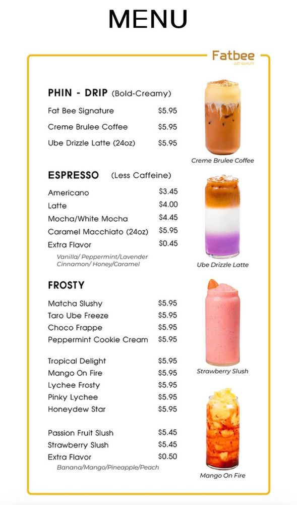 Introducing Fat Bee Cafe Shawnee, a charming dessert, bubble tea, and coffee spot located in Shawnee, KS. The cafe offers a range of delicious beverages, including unique espresso drinks like Ube Phin Laze and Hazel White Truffle, flavorful milk tea series such as Luv Strawberry Coconut and Winter Melon Milk Tea, and creative lattes like Biscoff Boba Latte and Creme Brulee Boba Latte. Customers rave about the fantastic drinks, cozy ambiance, and friendly service. The menu is extensive, with plenty of dairy-free options available. Whether you're a coffee enthusiast or a bubble tea lover, Fat Bee Cafe Shawnee is sure to delight your taste buds. Don't miss out on the opportunity to try their mouthwatering drinks and experience the pure happiness in every sip!
